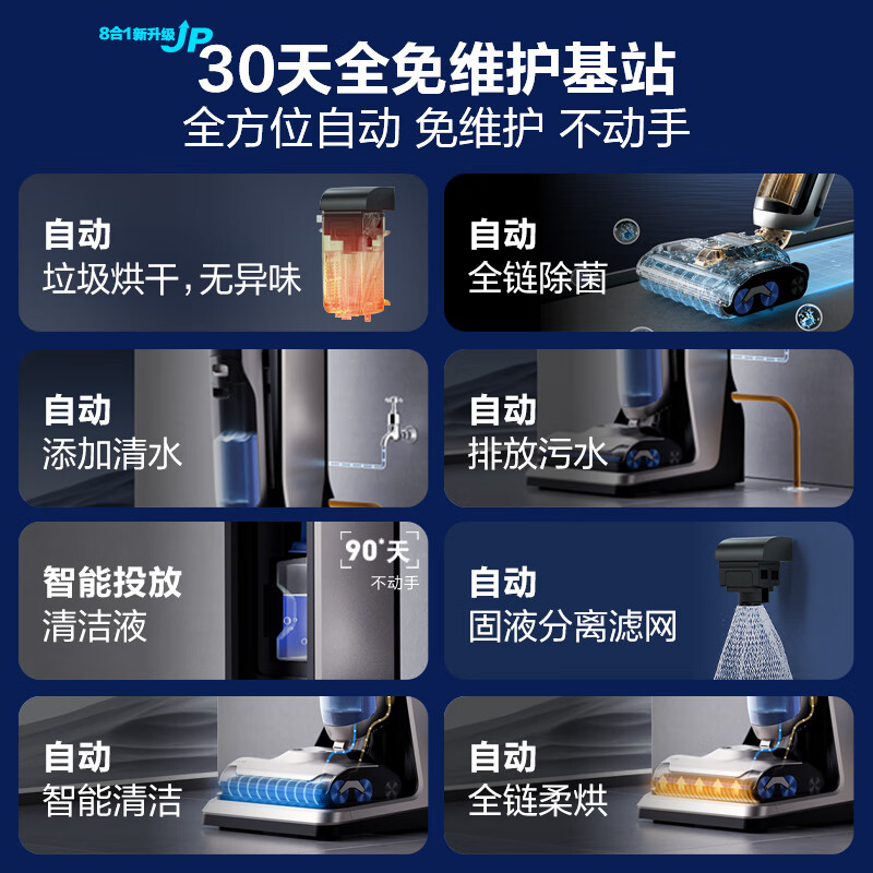 特色功能:语音提示,烘干,沿边清洁,垃圾干湿分离,双滚刷,吸水,除菌,基站款,毛发防缠绕