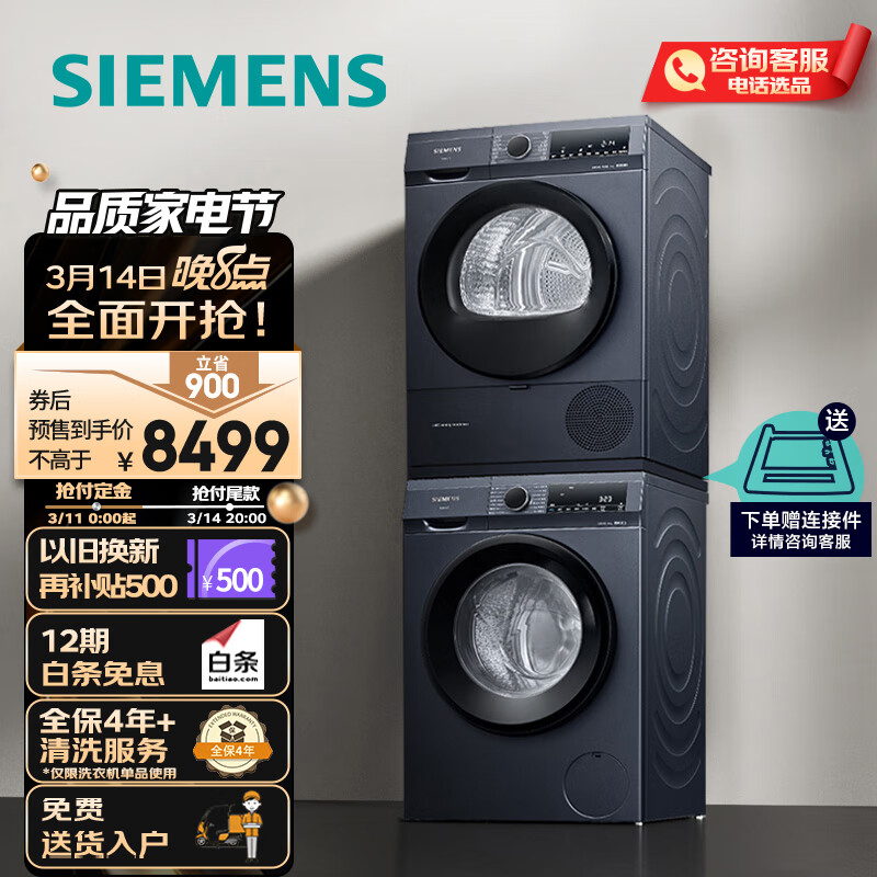 西门子(SIEMENS)湖蕴蓝洗烘套装 10kg智能除渍洗衣机+9kg热泵烘干机家用 WG52A1X14W+WQ45A2D10W价格:9899.00元!