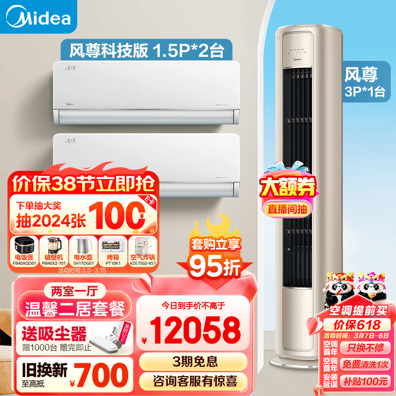美的(Midea)空调 风尊系列 温馨二居套餐 两室一厅套装(1.5匹风尊科技版一级*2+3匹风尊柜机一级)价格:12797.00元!