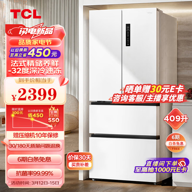 TCL409升白色法式多门四开门对开门家用电冰箱风冷无霜一级能效双变频 智慧变温空间 R409V5-D象牙白价格:2499.00元!