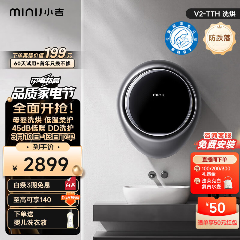 小吉(MINIJ)智控壁挂洗烘一体洗衣机 迷你母婴洗衣机 APP操控全自动滚筒除菌烘干机V2-TTH价格:2899.00元!