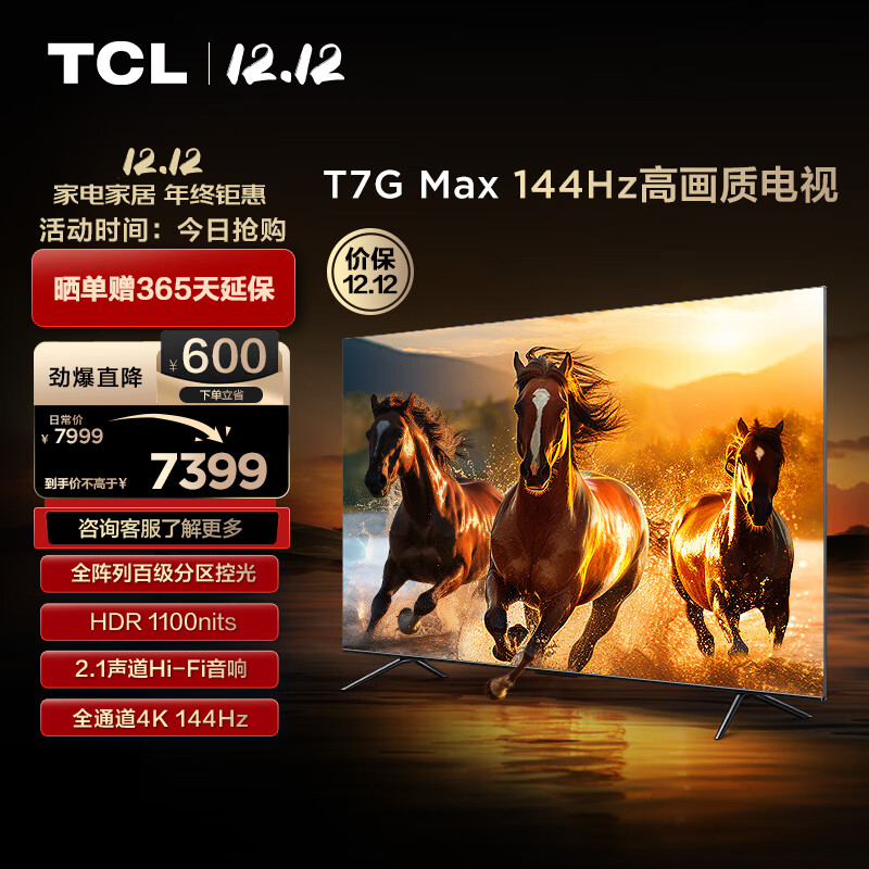TCL电视 85T7G Max 85英寸 百级分区 HDR1100nits 4K 144Hz 2.1声道音响 巨幕智能液晶平板游戏电视机价格:7399.00元!