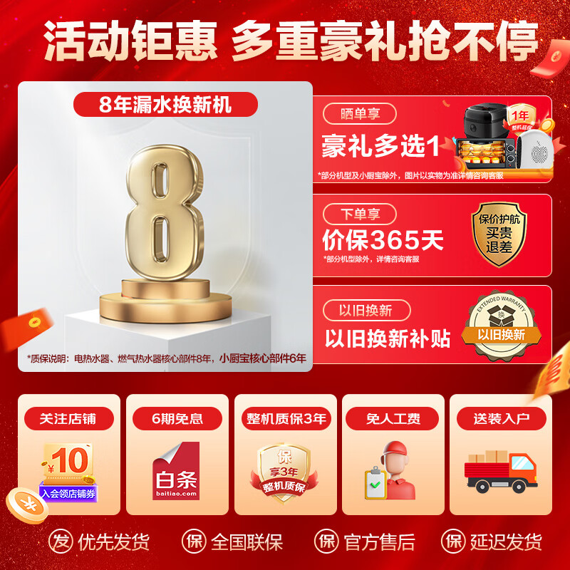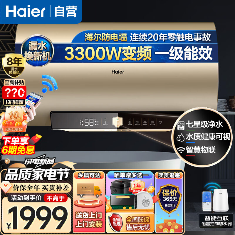 海尔100升热水器电热水器家用储水式3300W变频速热一级能效WiFi智慧物联七净水洗水质健康可视GA3价格:1999.00元!