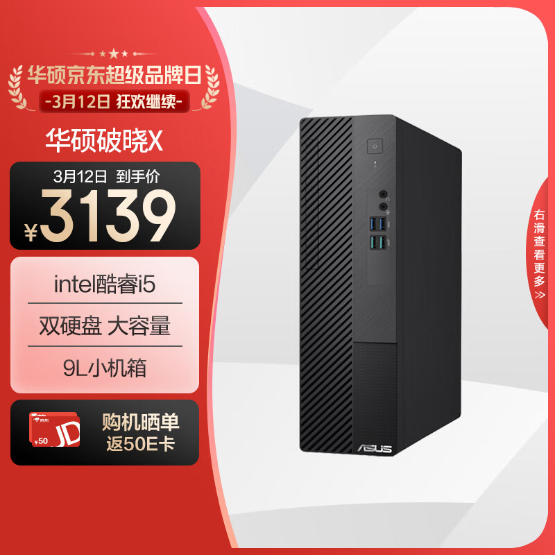 华硕破晓X 个人办公家用商用台式机电脑主机(12代intel i5-12400 16G 512GSSD+1T wifi 小机箱)价格:3139.00元!