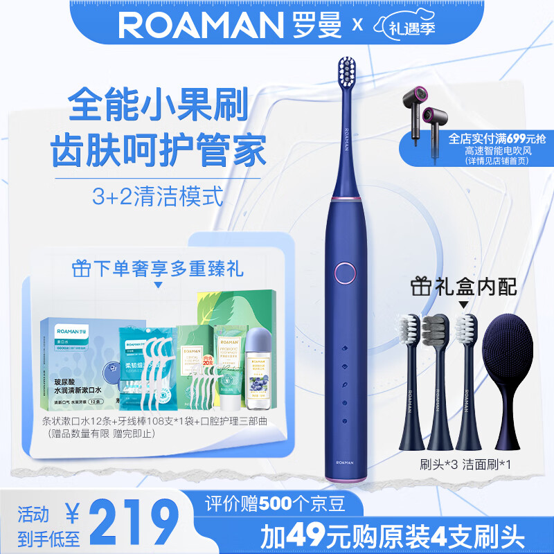 罗曼(ROAMAN)智能声波电动牙刷情侣款生日礼物 5种模式牙医推荐 网红小果刷1年续航 深空蓝款 新年礼物价格:289.00元!