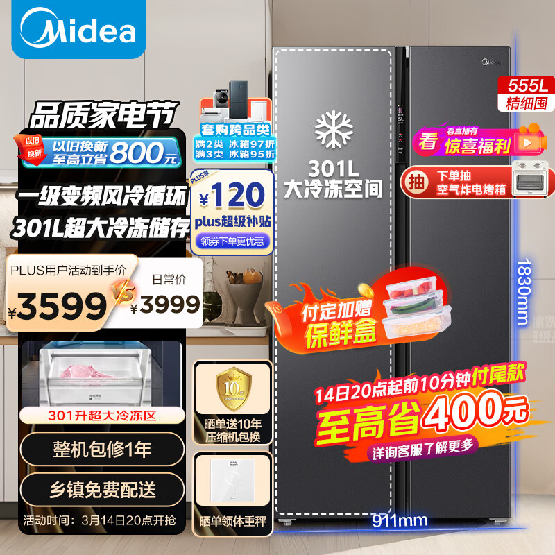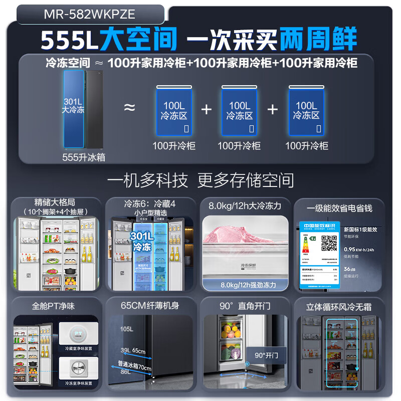 美的(Midea)555升超大冷冻空间双变频一级能效对开门双开门智能家用电冰箱节能风冷无霜超薄可嵌入MR-582WKPZE价格:3999.00元!