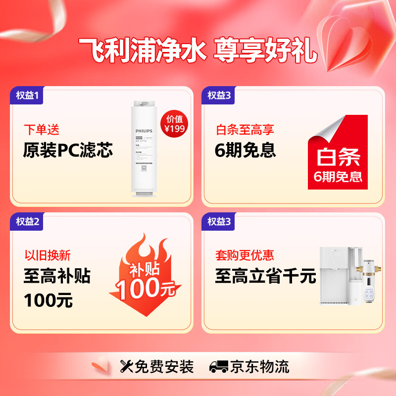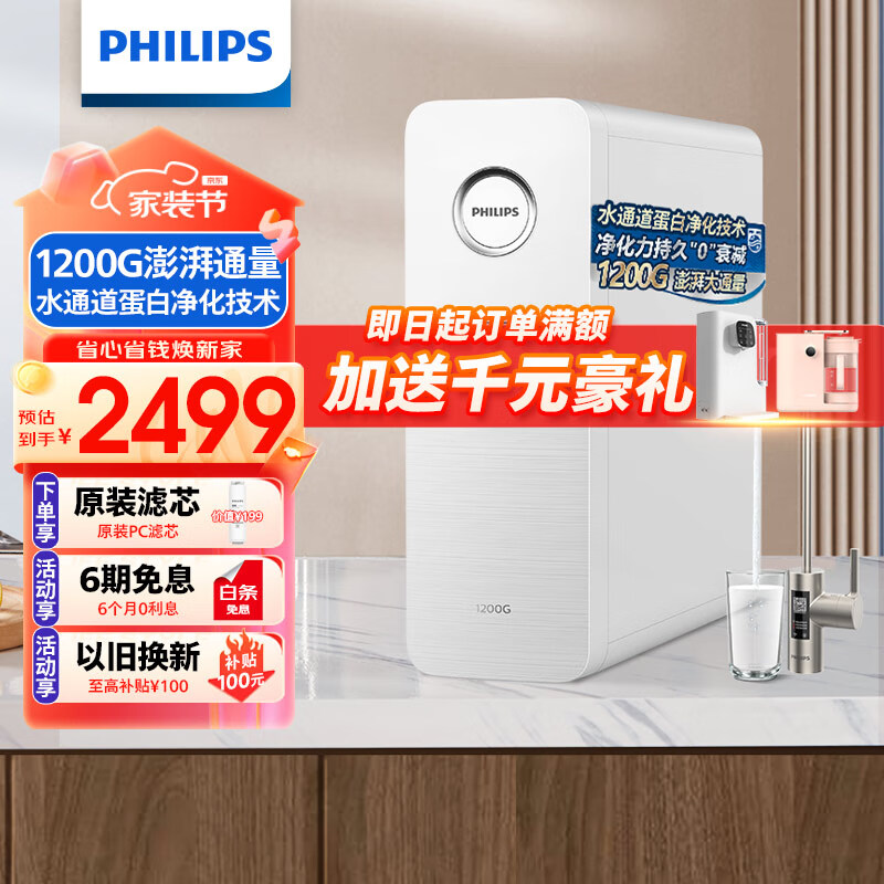 飞利浦(PHILIPS)净水器家用净水机引擎1200G 5年长效RO反渗透 3.1L/分大流速 母婴直饮 智能双出水净水器AUT7010价格:2499.00元!