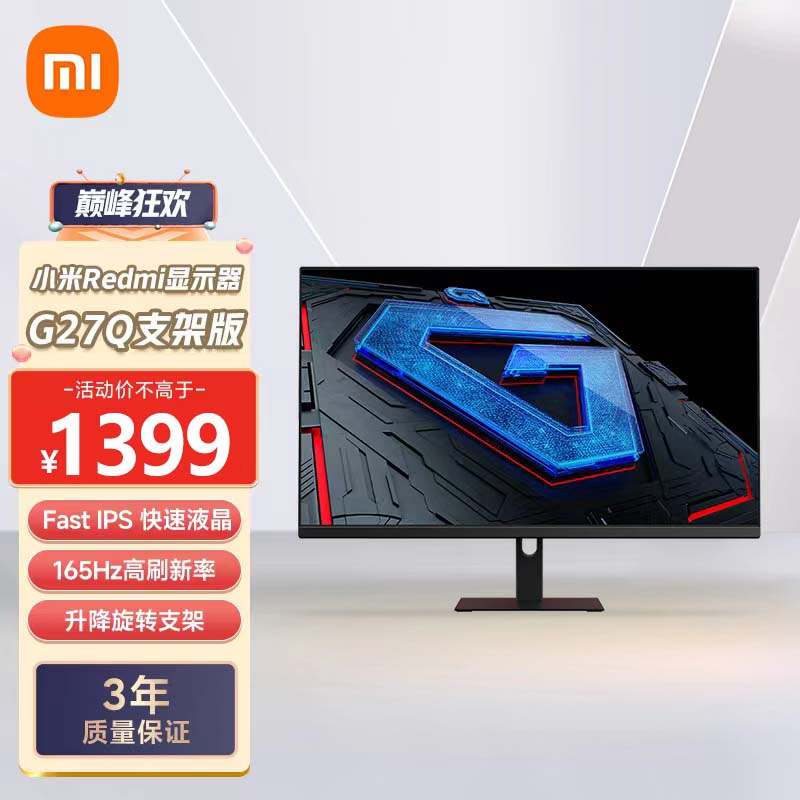 小米 Redmi 27英寸2K电竞显示器 G27Q升降旋转支架 Fast IPS 165Hz刷新率 HDR400 Type-C接口价格:1399.00元!