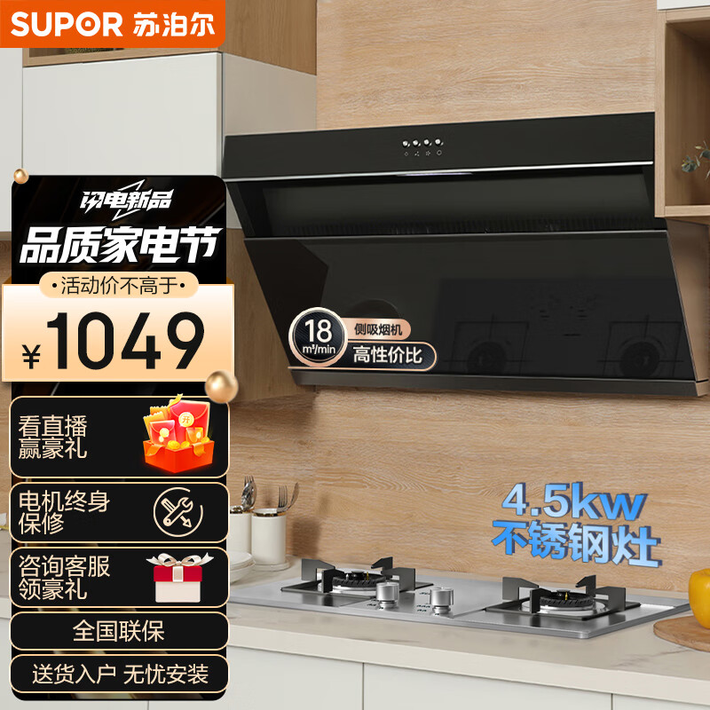 苏泊尔(SUPOR) 抽油烟机烟灶套装 18立方爆炒侧吸式家用吸油烟机燃气灶套装 DJ13+DS27天价格:1049.00元!