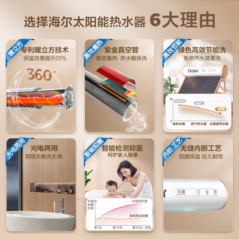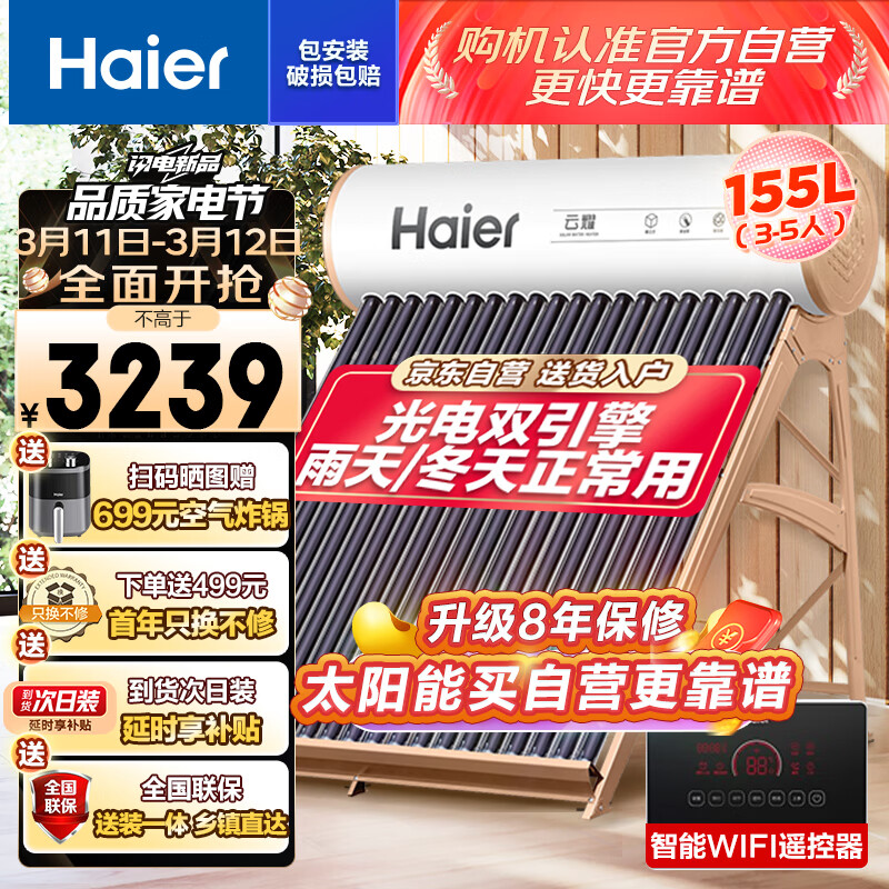 海尔(Haier)太阳能热水器家用一级能效专利聚热环WIFI自动上水光电两用 20支管-155升-J6价格:3539.00元!