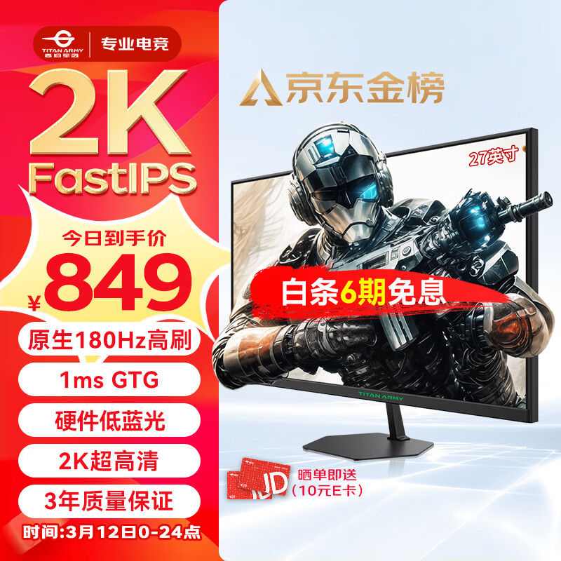 泰坦军团 27英寸 2K 原生180Hz FastIPS快速液晶 广色域显示屏 1ms电竞显示器 窄边框电脑办公游戏屏P27H2R价格:1199.00元!