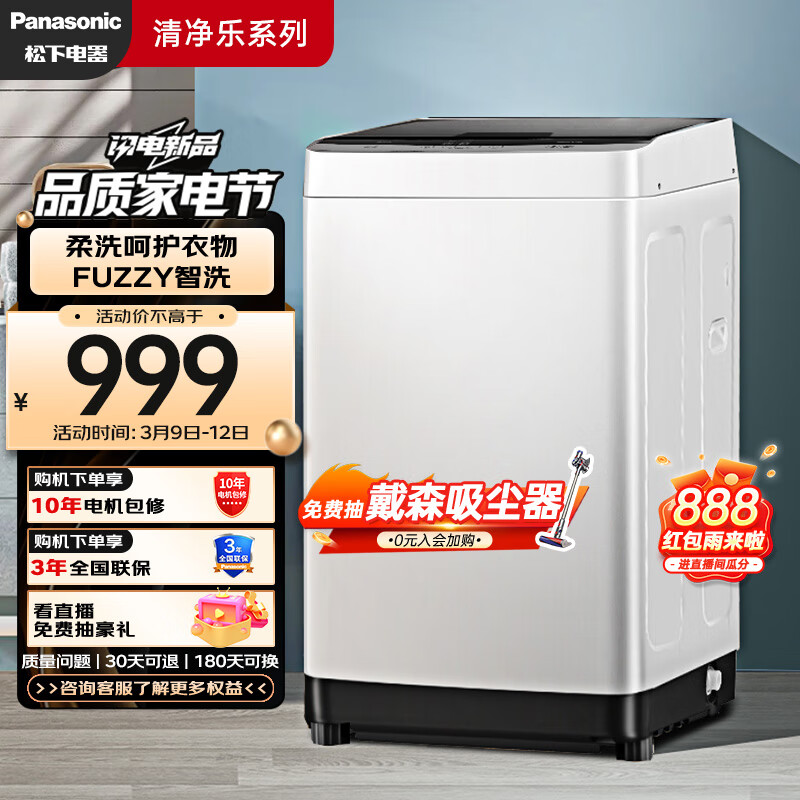 松下(Panasonic)洗衣机全自动波轮 8公斤家用宿舍租房老人 节能省电省水 人工智能 桶洗净 XQB80-KYA0N价格:999.00元!