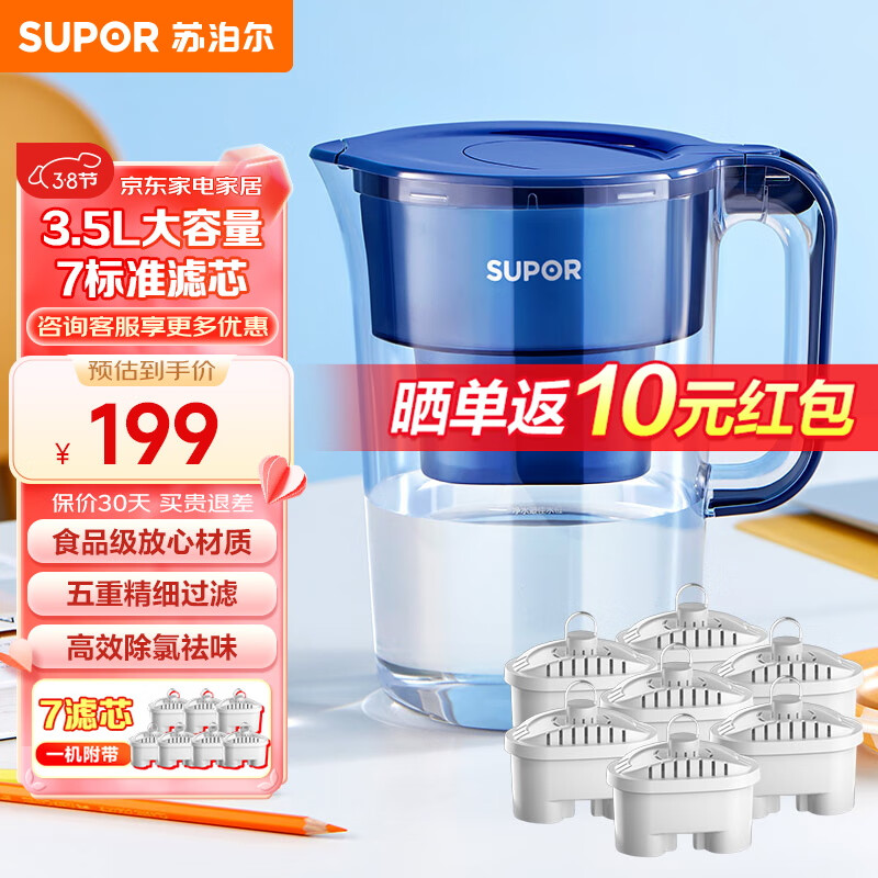 苏泊尔(SUPOR)净水壶自来水活性炭过滤器家用厨房净水器直饮滤水器滤水壶UF03【一机七芯】价格:199.00元!