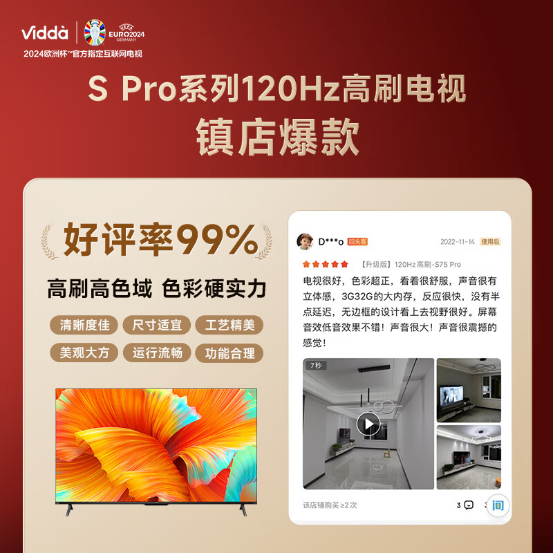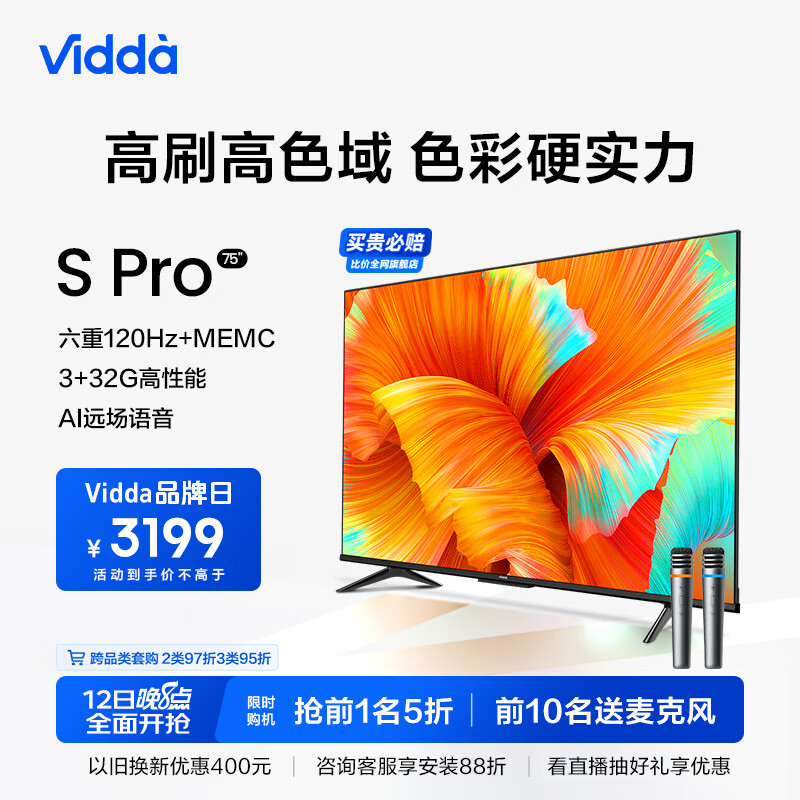 Vidda S75 Pro 海信 75英寸 120Hz高刷 4K超薄屏 3+32G MEMC防抖 智能液晶巨幕电视以旧换新75V1K-S价格:3199.00元!