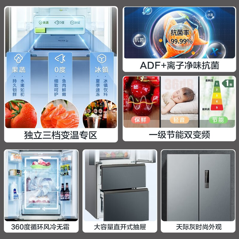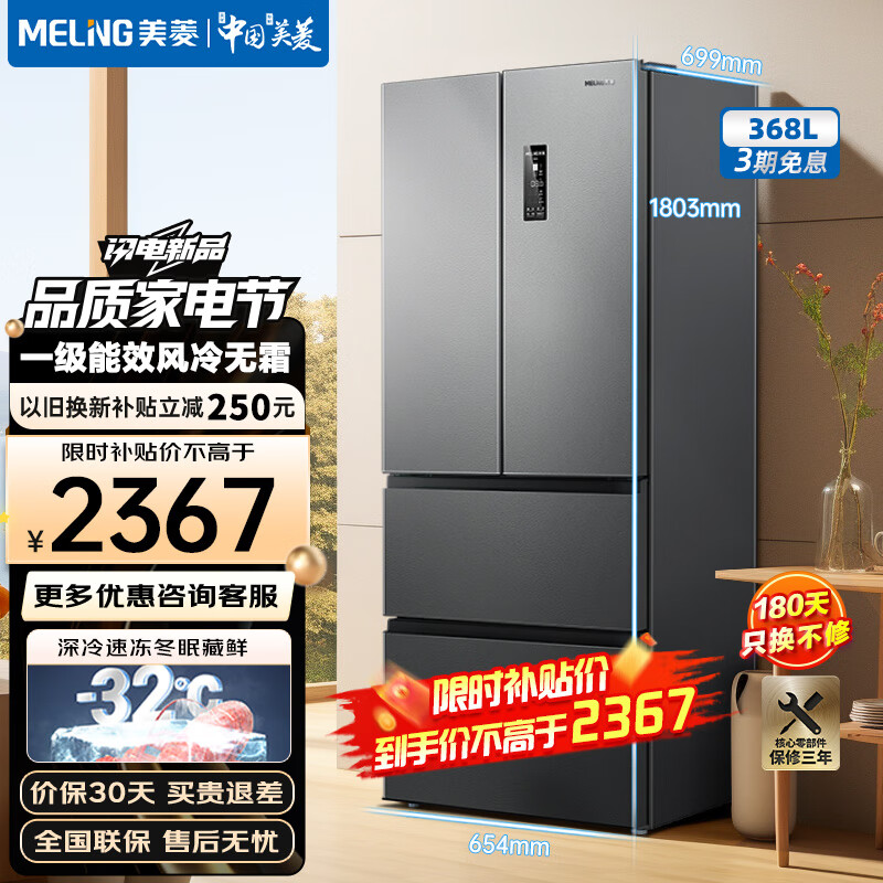 美菱冰箱(MELING)368升四门家用冰箱双开门风冷无霜双变频一级能效对开门法式电冰箱 BCD-368WPC ADF+离子长效净味价格:2367.00元!