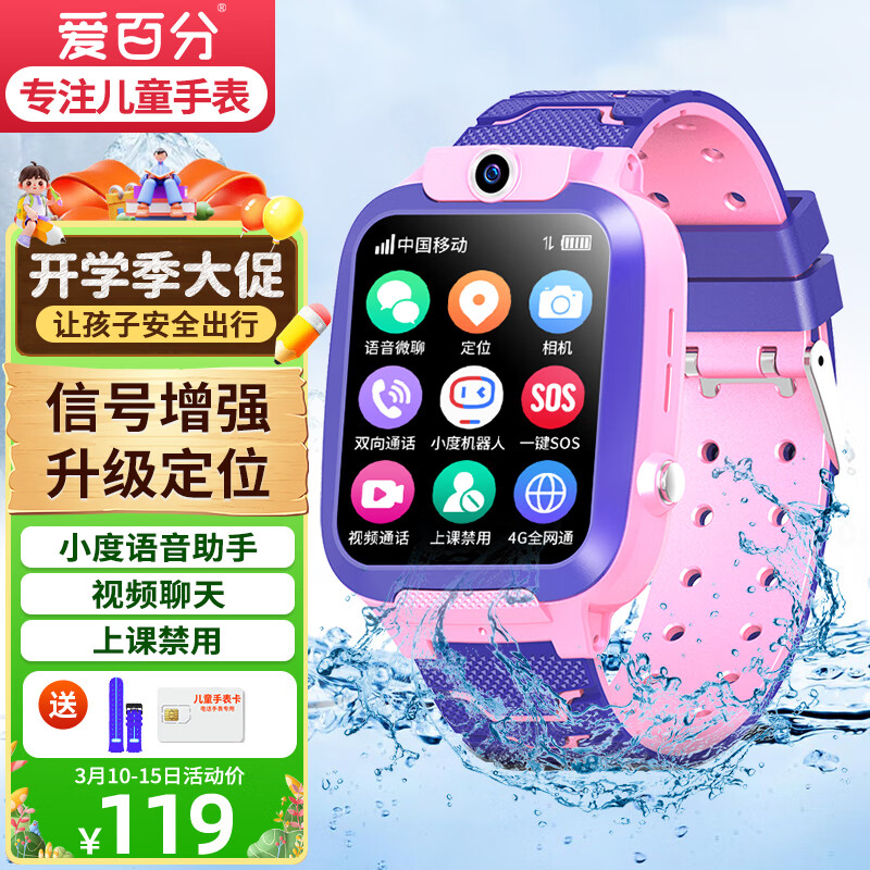 爱百分 儿童智能电话手表移动联通电信版手机学生男孩女孩精准定位拍照触屏视频通话儿童节礼物 粉色升级版(长续航+定位升级+视频+微聊+禁用)价格:139.00元!