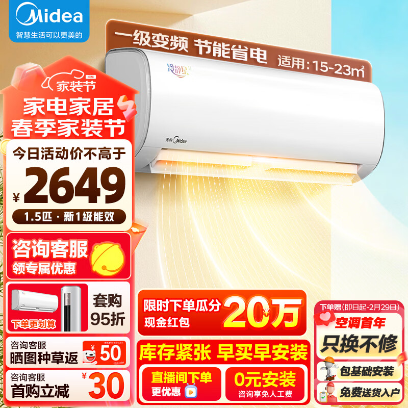 美的(Midea)空调1.5匹挂机 冷静星二代 新一级能效 变频冷暖 壁挂式 KFR-35GW/BDN8Y-PH200(1)A 卧室书房空调价格:2649.00元!