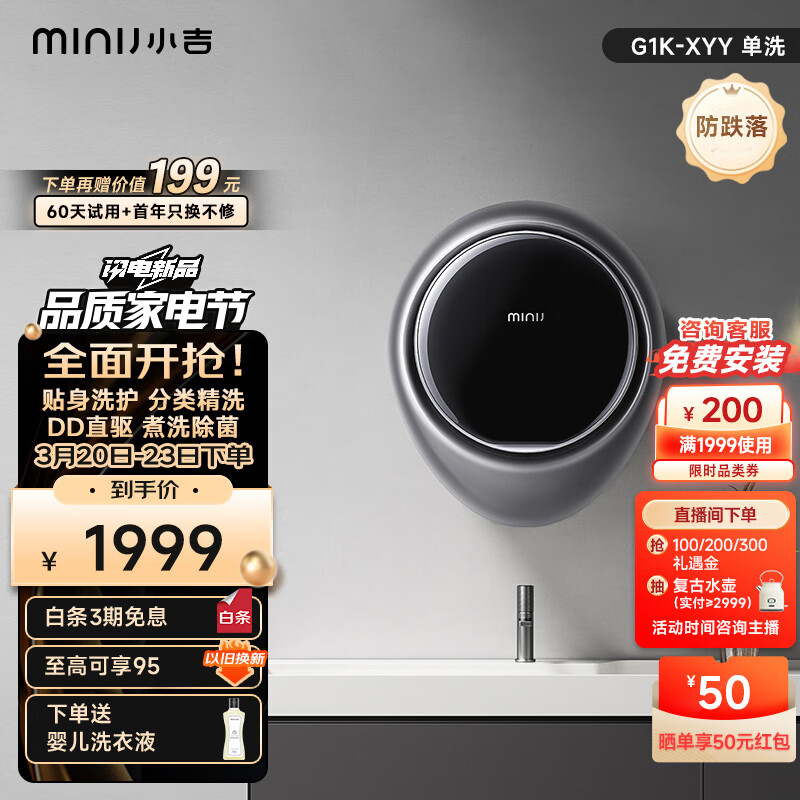 小吉(MINIJ)智能壁挂式全自动滚筒洗衣机 婴儿宝宝儿童迷你洗G1K-XYY 以旧换新价格:1999.00元!