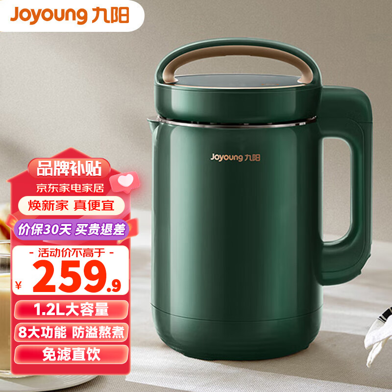 九阳(Joyoung)豆浆机家用1.2L破壁免滤预约时间304不锈钢3-4人多功能防溢熬煮易清洗 D260(复古绿)价格:369.90元!