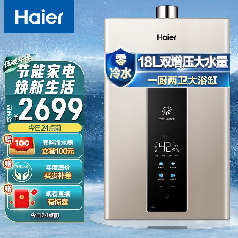 海尔(Haier)18升双增压零冷水燃气热水器燃气 WIFI云定制 节能大水量 JSQ34-18JX3(12T)U1 京东小家智能价格:2592.00元!