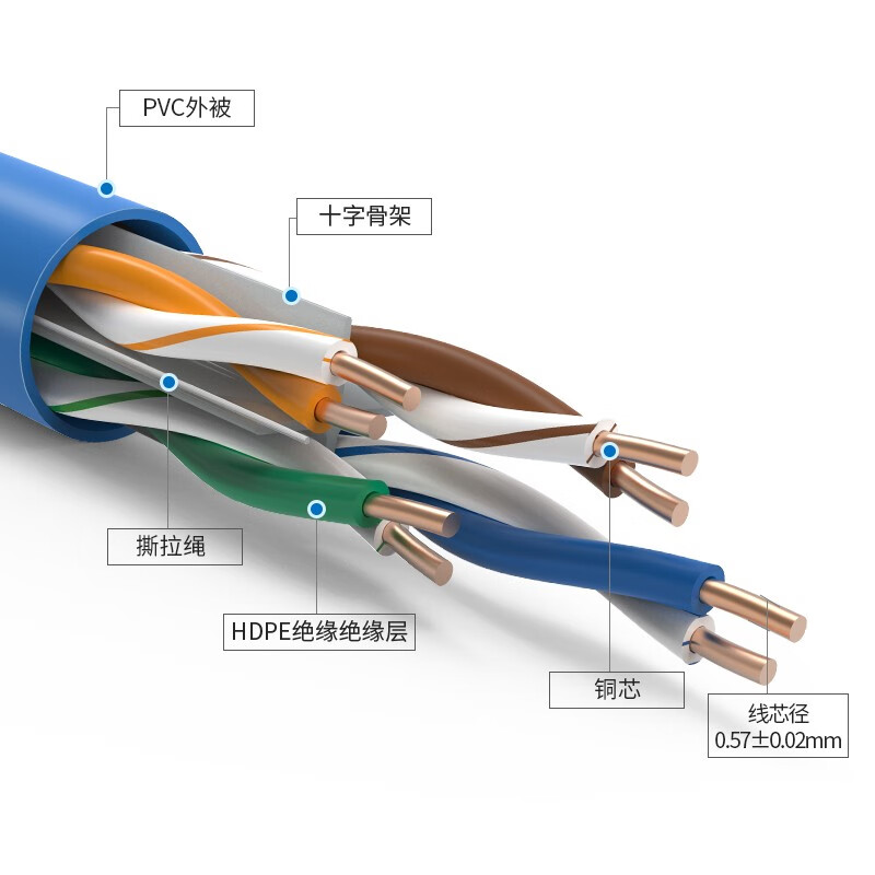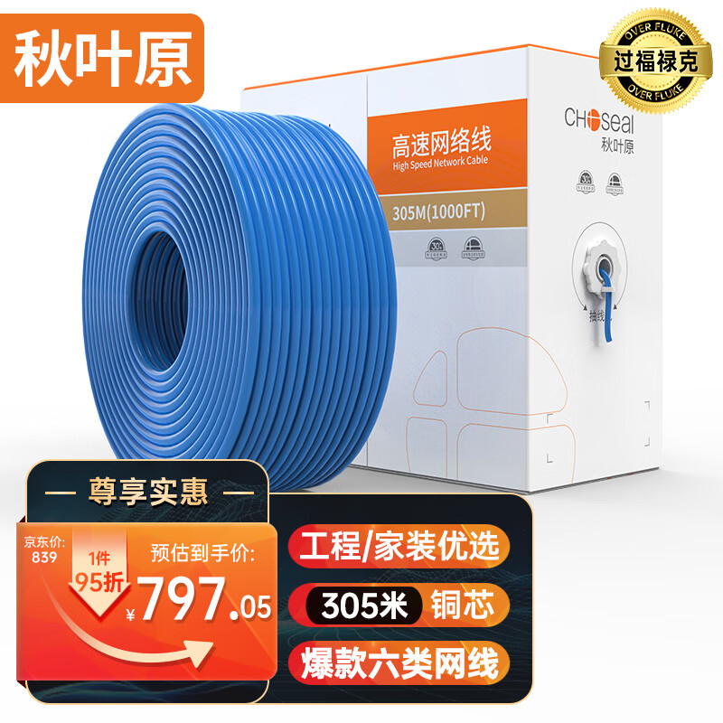 秋叶原(CHOSEAL)六类网线【工程版0.57±0.02mm】CAT6纯铜线芯阻燃非屏蔽千兆网线蓝色305米QS2619BT305价格:839.00元!