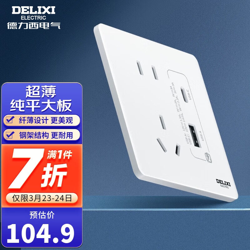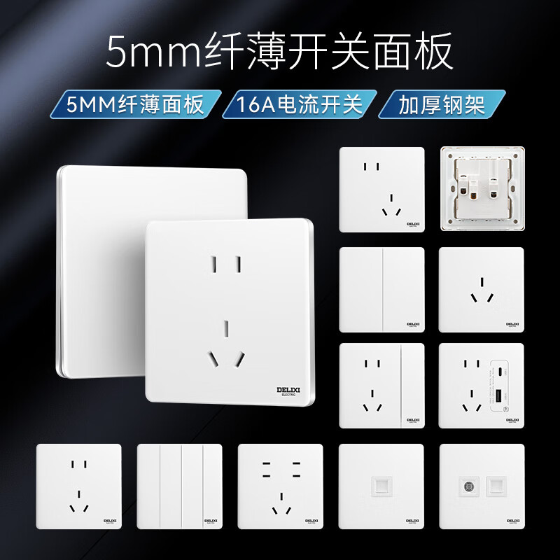 德力西(DELIXI) 开关插座面板290系列墙开无框大板86型暗装 超薄电源面板极地白 Type-c+USB五孔插座价格:149.90元!