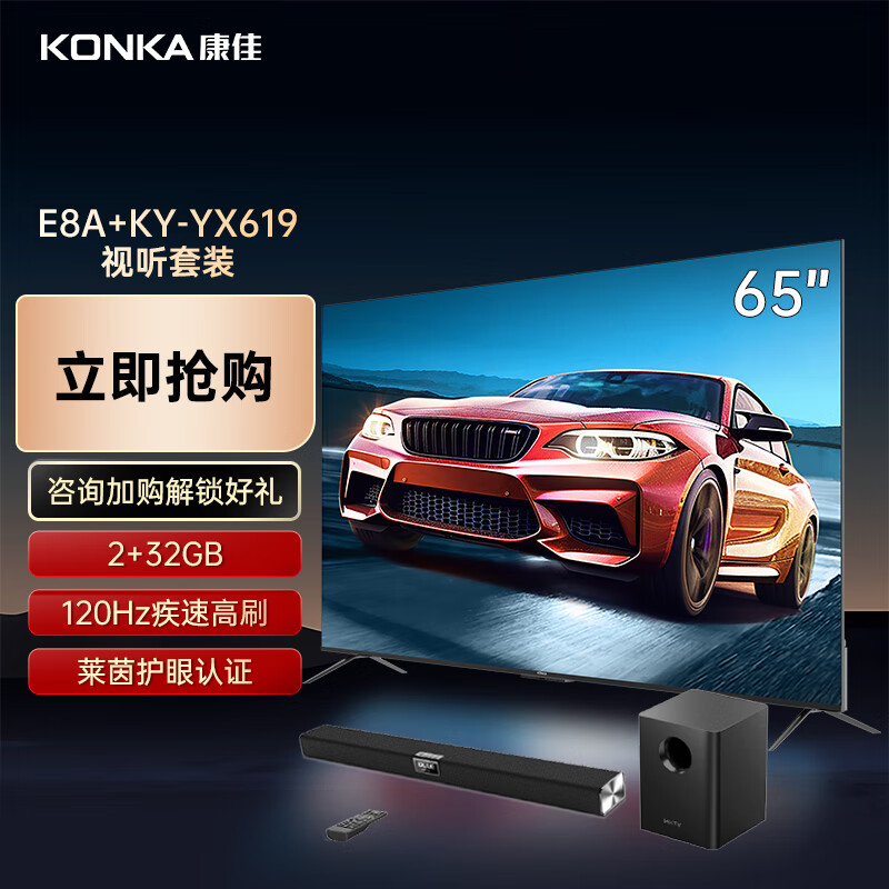 康佳电视 65E8A 65英寸 2+32GB 120Hz高刷护眼电视+KKTV KY-YX619 回音壁5.1价格:2798.00元!