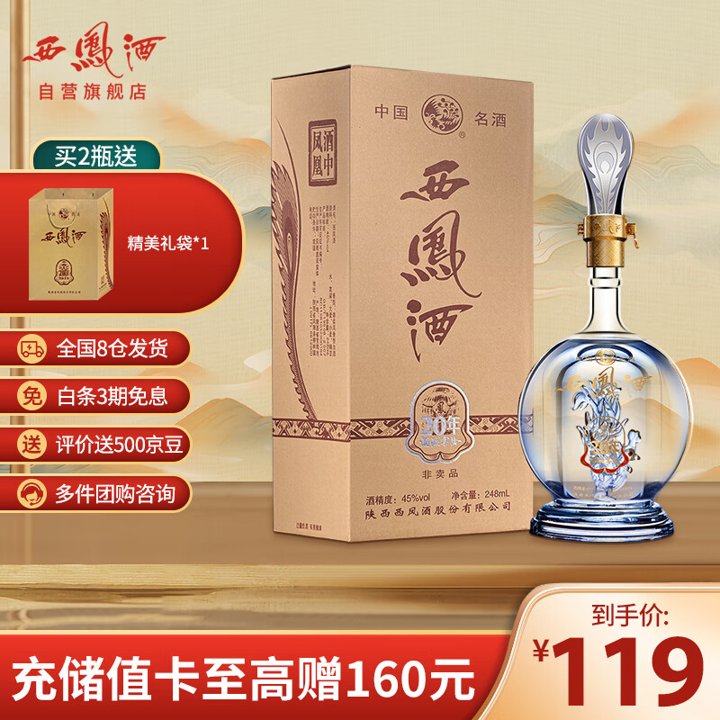 西凤酒 20年45度品鉴陕西纯粮食凤香型白酒海窖龄年货送礼盒装248mL*1价格:89.00元!