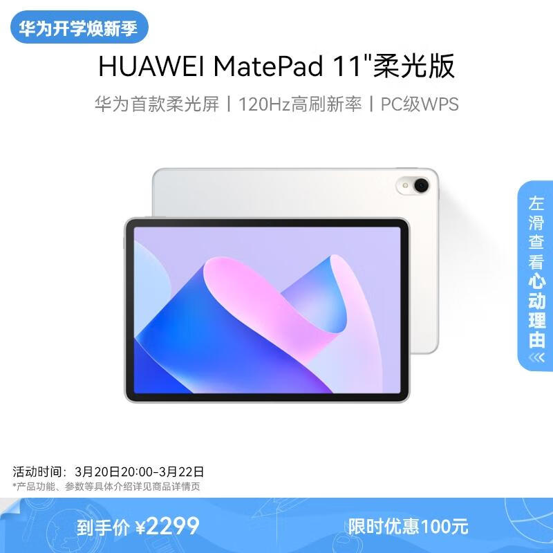 HUAWEI MatePad 11英寸2023款柔光版华为平板电脑120Hz高刷2.5K护眼屏娱乐学习 8+128GB WIFI 晶钻白价格:2399.00元!