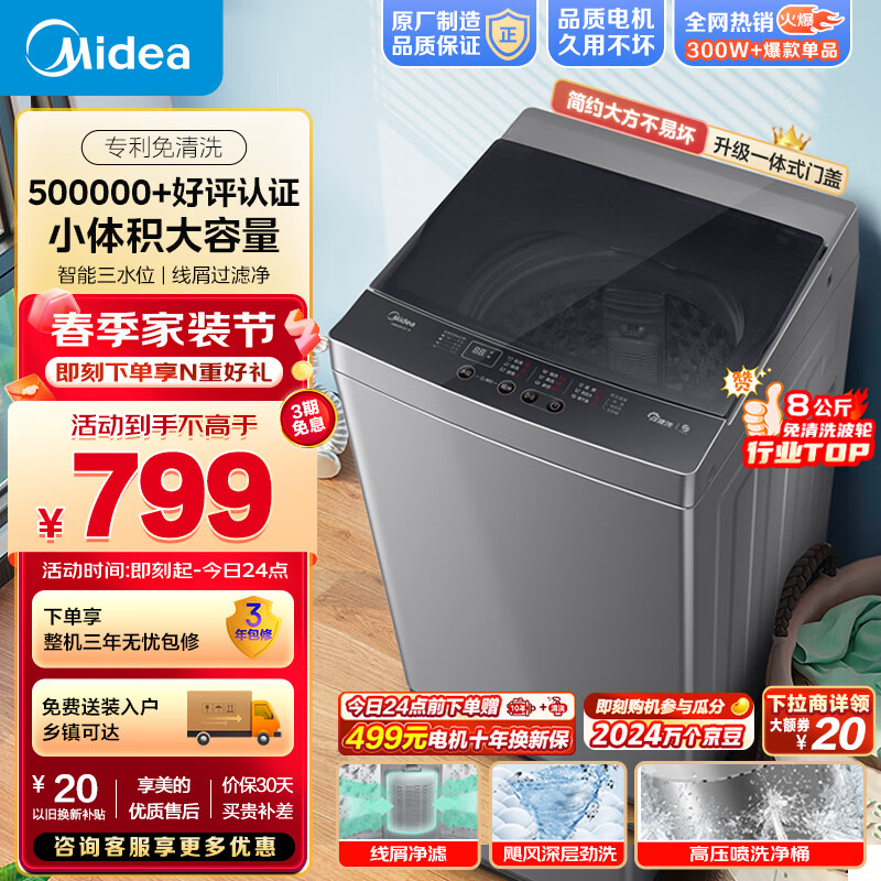 美的(Midea)波轮洗衣机全自动 8公斤 洗衣机小型 专利免清洗 十年桶如新 宿舍租房神器 随心洗系列 MB80ECO1价格:799.00元!
