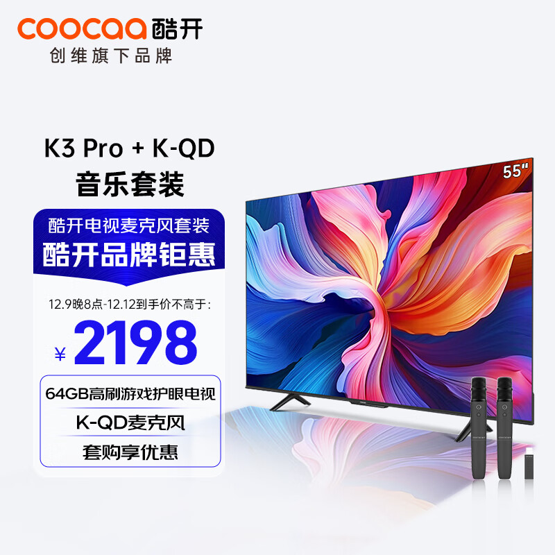 酷开创维 55英寸高刷电视机K3 Pro+K-QD麦克风套装 K歌电视 家庭KTV无线降噪话筒唱歌会议 双支麦克风价格:2198.00元!