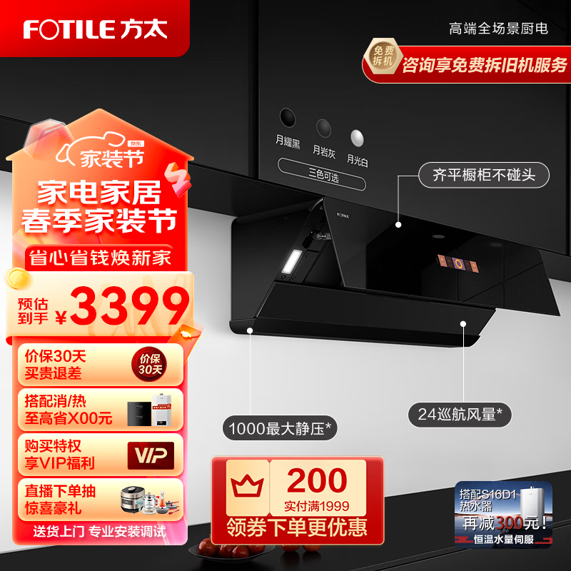 方太(FOTILE)抽吸油烟机 侧吸式家用厨房油烟机 24巡航风量 挥手智控 方太新月系列 月耀黑 01-F1A价格:3399.00元!