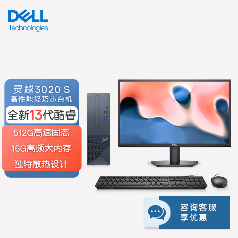 戴尔(Dell)灵越3020S 新款 台式电脑主机 高性能整机 台式机 商用办公电脑 教育学习 图形设计 (13代i5-13400 16G 512GSSD三年上门)23.8英寸大屏显示器价格:3899.00元!