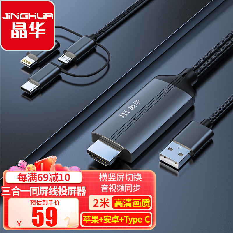 晶华 三合一同屏线投屏器 苹果Lightning安卓Type-C转HDMI高清转换线器手机平板连接电视显示器 2米 Z505G价格:59.00元!