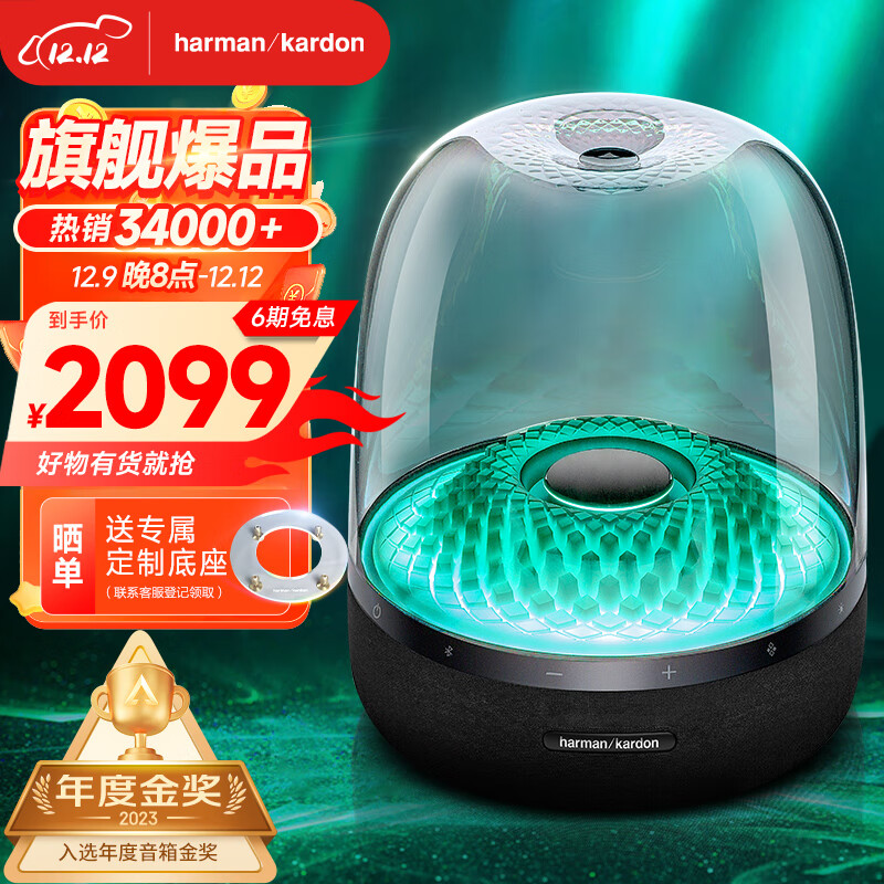 哈曼卡顿 音乐琉璃四代4代 360°环绕立体声 菱形氛围灯效 桌面蓝牙音箱 Aura Studio4价格:2399.00元!