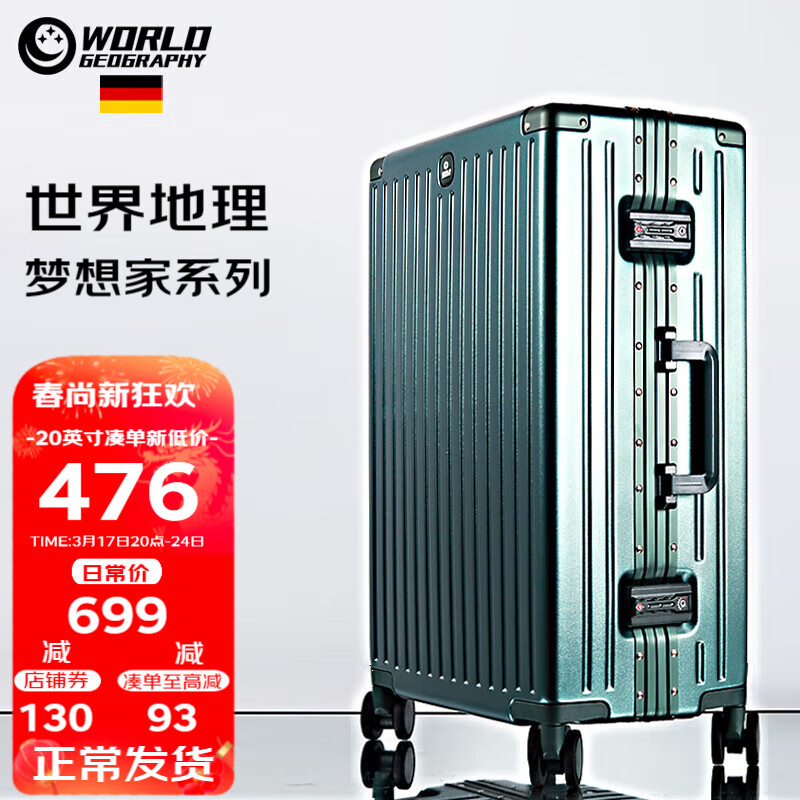 地理德国行李箱男女20英寸登机旅行箱铝框拉杆箱万向轮密码箱 英伦绿价格:699.00元!