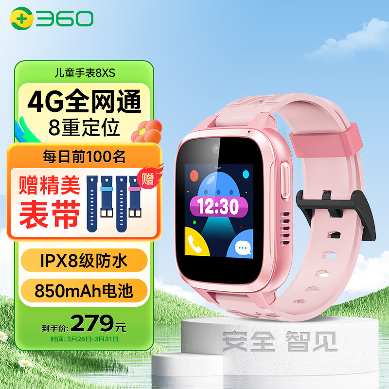 360儿童电话手表8XS 智能语音问答定位支付 学生儿童移动联通电信4G防水视频拍照手表男女孩西瓜粉价格:299.00元!