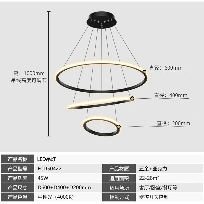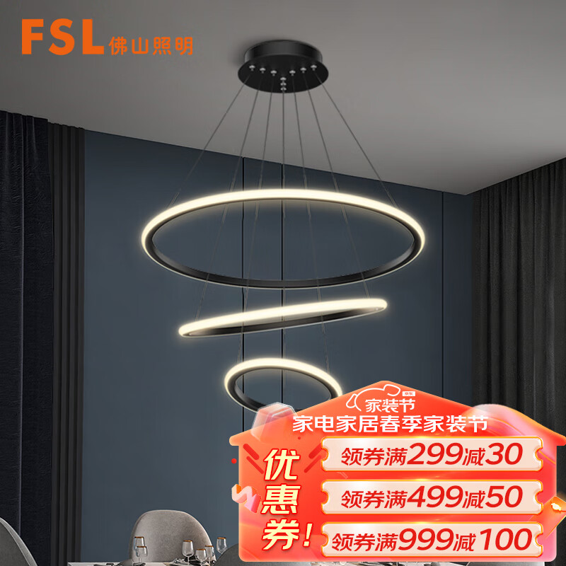 FSL佛山照明餐吊灯LED客厅灯北欧后现代铁艺灯具单色暖白光50422/45W价格:359.00元!