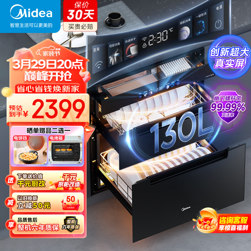 美的(Midea)消毒柜家用 嵌入式 厨房餐具碗柜碗筷茶杯 超真实屏 紫外线 婴儿奶瓶 130L三层大容量130HQ3-PRO价格:2599.00元!