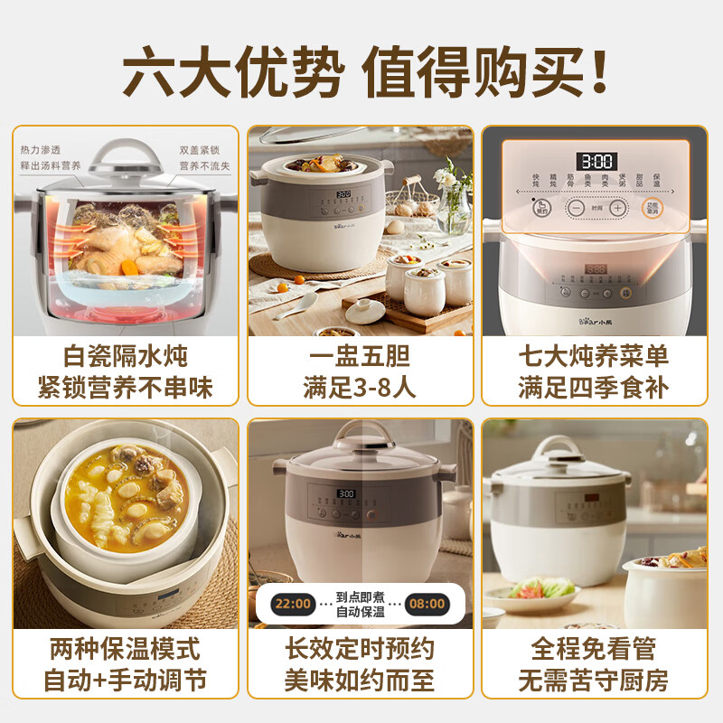 小熊(Bear) 电炖锅 炖汤锅 电炖盅 家用陶瓷锅隔水炖锅 煲汤锅熬汤煲大容量3-5人 大内胆可炖一鸡煮粥养生锅 白瓷电炖锅 4.5L价格:259.00元!