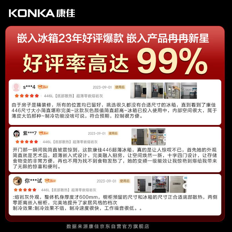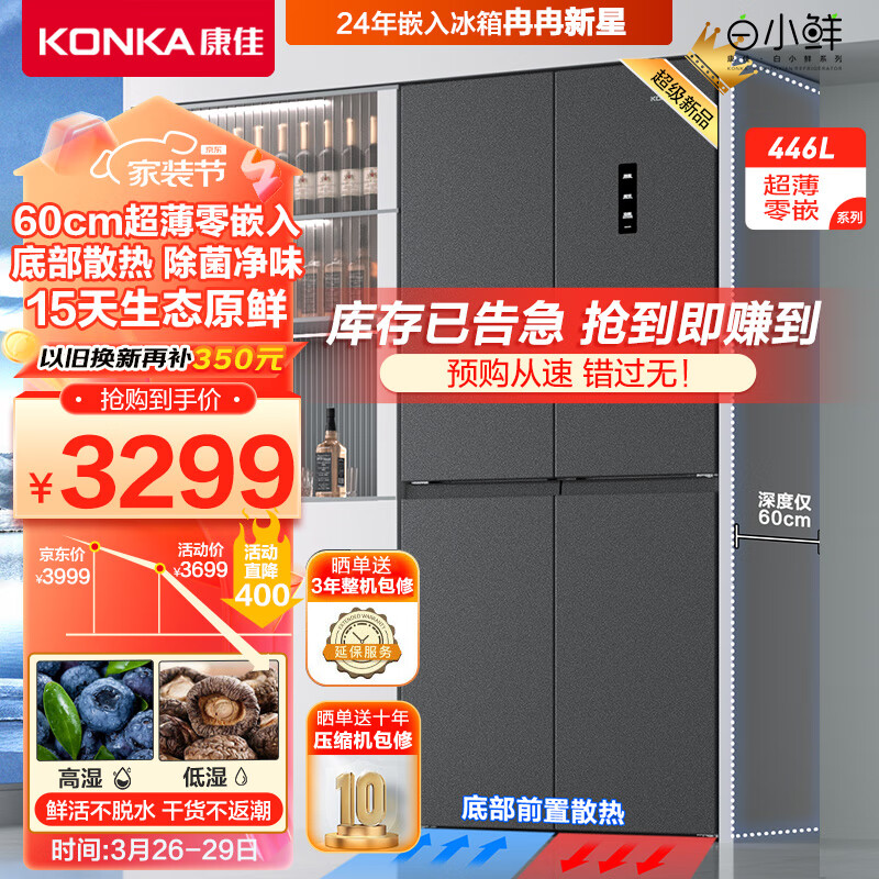 康佳446升60厘米零嵌超薄嵌入式底部散热一级能效双变频无霜双循环十字对开双开四开门电冰箱45FW4PA价格:3299.00元!
