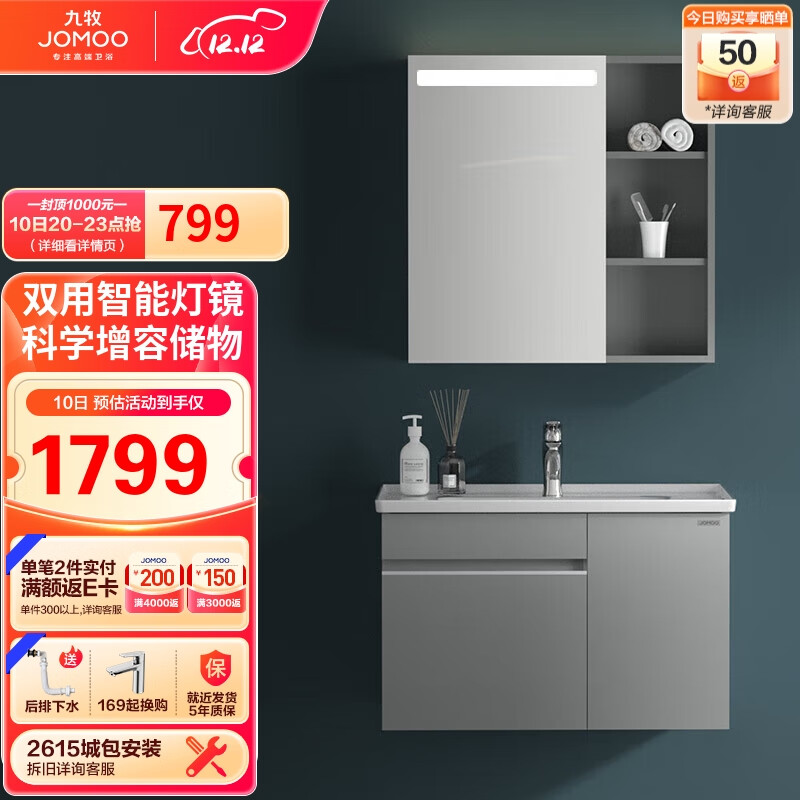 九牧(JOMOO)极简浴室柜陶瓷一体盆洗大收纳智能灯镜柜组合70cm A2715-13HU-6价格:2149.00元!