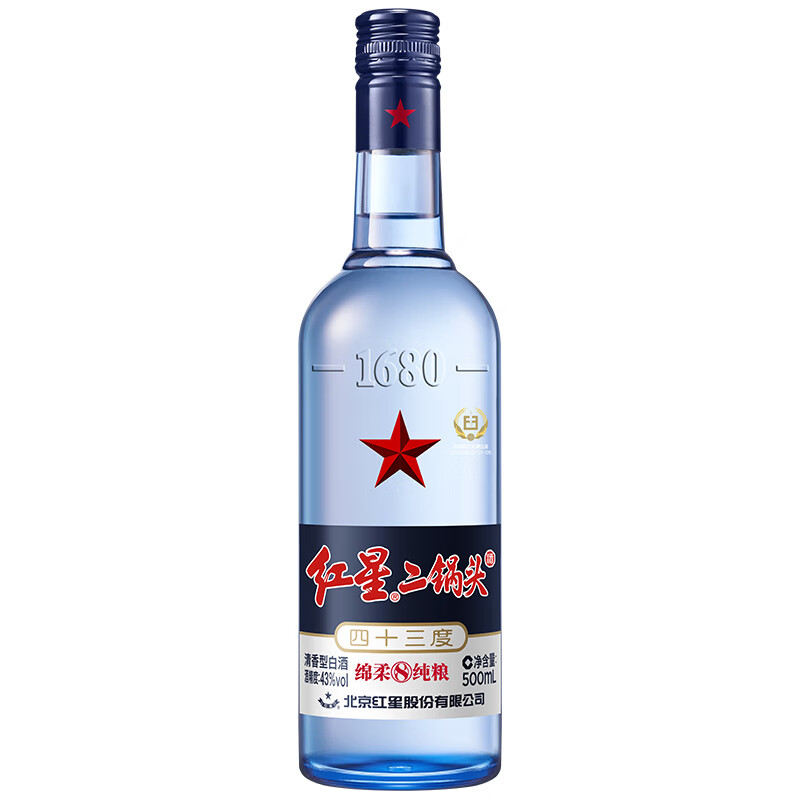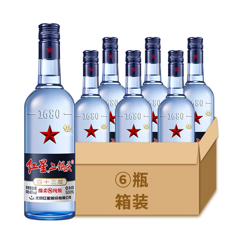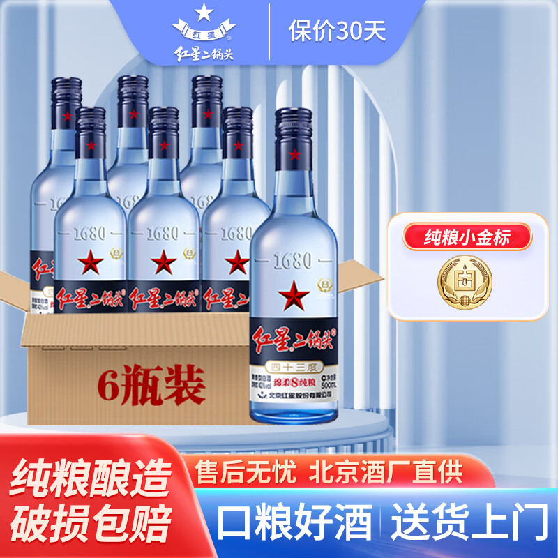 红星【产地北京】北京二锅头蓝瓶绵柔8清香型纯粮白酒43度500ml*6瓶价格:200.00元!