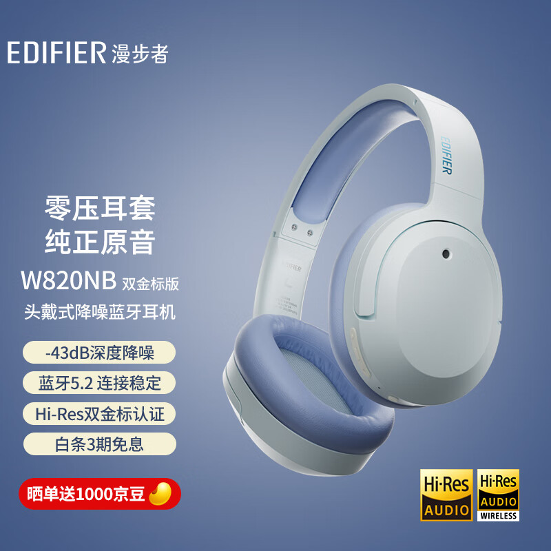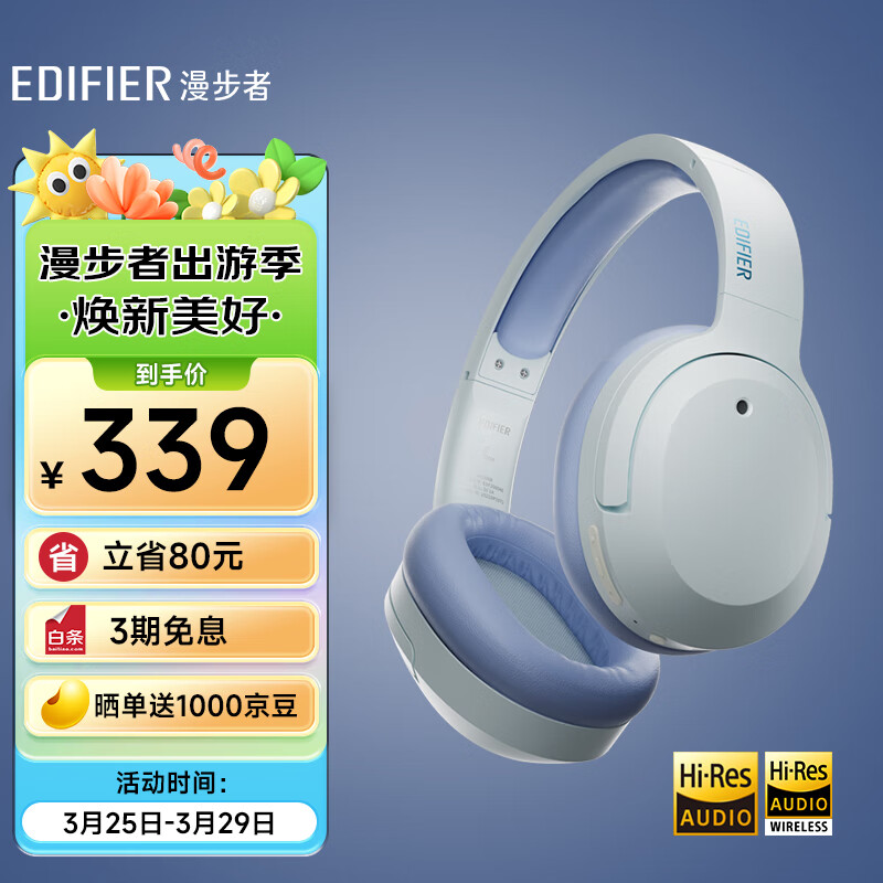 漫步者(EDIFIER)W820NB双金标版 头戴式主动降噪蓝牙耳机 蓝牙5.2 手机电脑笔记本耳机 湖光蓝价格:339.00元!