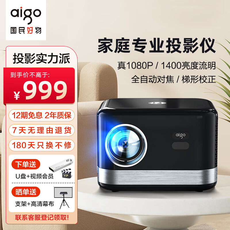 爱国者H08投影机家用投影仪办公1080P家庭影院(1400亮度流明1+32G内存 自动对焦校正 自动入幕)价格:999.00元!