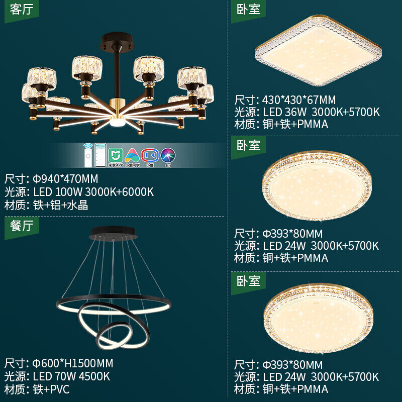 雷士(NVC)欧美现代简约客厅灯卧室餐厅灯臂发光吊灯全屋套餐WHXD100W/G-01价格:3340.00元!