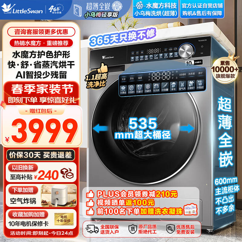 小天鹅(LittleSwan)洗衣机全自动家用洗烘一体10公斤滚筒水魔方小乌梅轻享版超薄全嵌智能投放大筒径SC18价格:3899.00元!