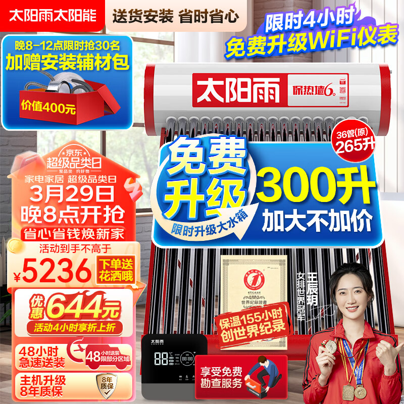 太阳雨 (Sunrain)太阳能热水器 家用全自动上水 光电两用 一级能效配智能仪表电加热保热墙6代36管265L价格:5880.00元!