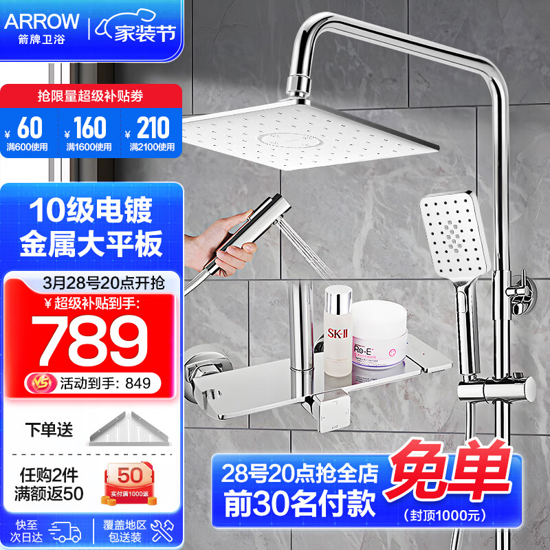 箭牌(ARROW)淋浴花洒套装 自洁淋浴喷头升级下出水 洗澡沐浴易洁手持顶喷 四功能平板自洁花洒3464S价格:1129.00元!