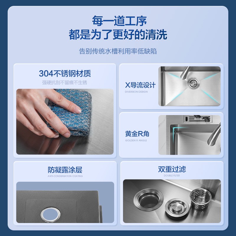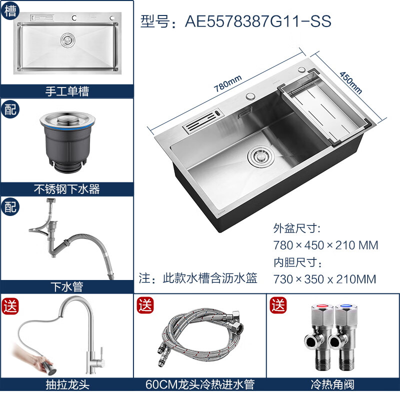 箭牌(ARROW) 304不锈钢加厚手工水槽大单槽厨房水槽洗菜盆一体盆大单槽 新78*45手工槽(含沥水篮+龙头)价格:1649.00元!